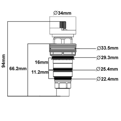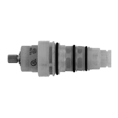 A European standard plastic resin bodied thermostatic shower cartridge with extended body and tapered design shaft – made by ALPI Italy.
