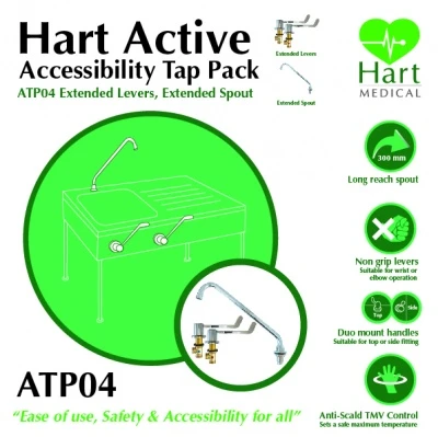 Supplied complete with extended lever panel valves (can be elbow or wrist operated) , long reach (300mm) swivel spout, special 800mm flexible connections and TMV2/3 ‘safety temperature’ Mixing Valve