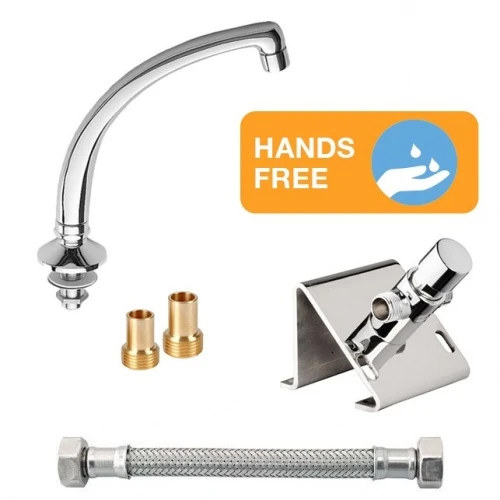 A commercial use Hands Free washing station including floor mounted foot operated flow control in its own frame, swivel spout and hose – operated by depressing the pedal by foot for hands free water dispensing.