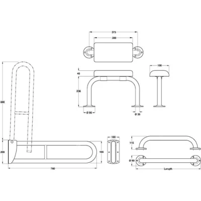 - Pack contains 5 x 60cm grab rails, 1 x hinged support rail & 1 cushioned back rest rail