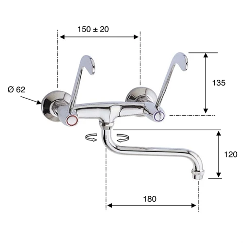 The Healthcare Series Wall Sink Tap is an elbow operated wall mounted long lever tap with fully rotating 180mm spout and 6″ long levers