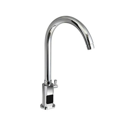 A mains/battery powered, temperature adjustable touchless sensor tap with 210mm long reach swivel spout.