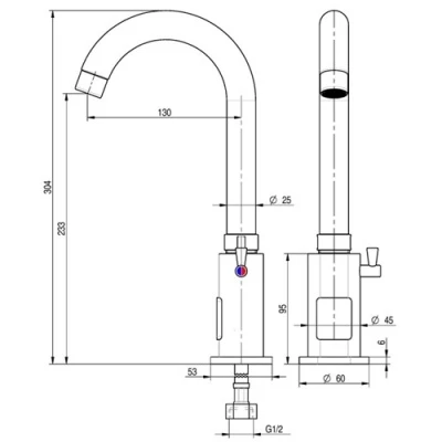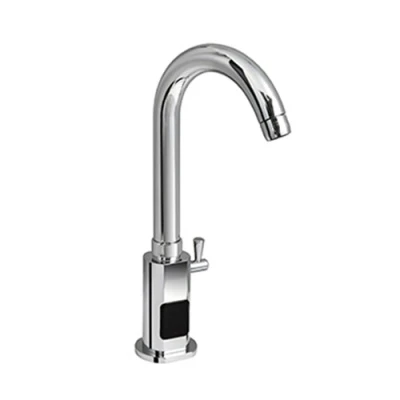 A mains/battery powered, temperature adjustable touchless sensor tap with short reach 130mm swivel spout.