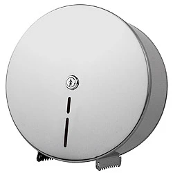 A wall fixed stainless steel toilet paper dispenser.