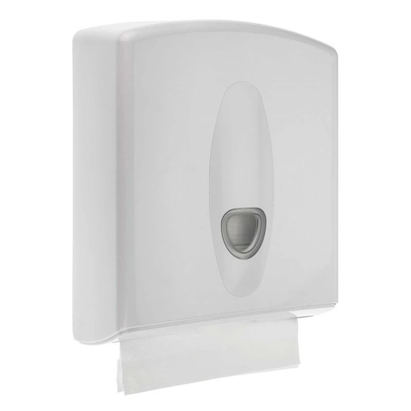 A commercial standard wall mounted paper towel dispenser made from durable white ABS plastic.