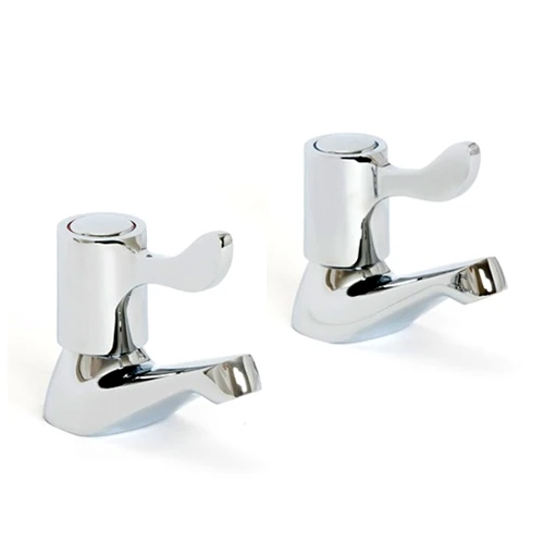 A pair of easy turn lever controlled bath pillar taps.The levers turn using a ceramic disk cartridge.