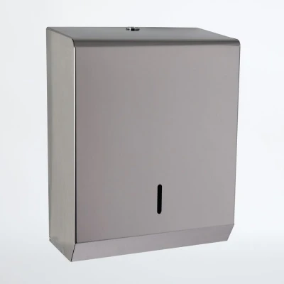 A commercial standard wall mounted paper towel dispenser made from stainless steel.