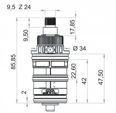 A high performance resin body screw fit thermostatic cartridge with stainless steel filter and safety system